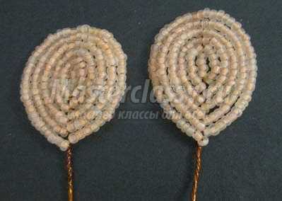 В 3 ряду используем уже 3 штуки бисера. 4-й ряд плетется аналогично. Чтобы сплести рядки с 5 по 10, необходимо нанизать по 2 бисера. В 11 и 12 ряд набираем по одной штуке бисера и протягиваем другой конец проволоки. Скручиваем концы. Необходимо сделать 2 такие заготовки.