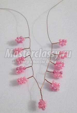 10 ряд – продеваем 2 бисеринки. Теперь два кончика проволоки туго, но аккуратно перематываем между собой. Вот так у нас получился один лепесток.