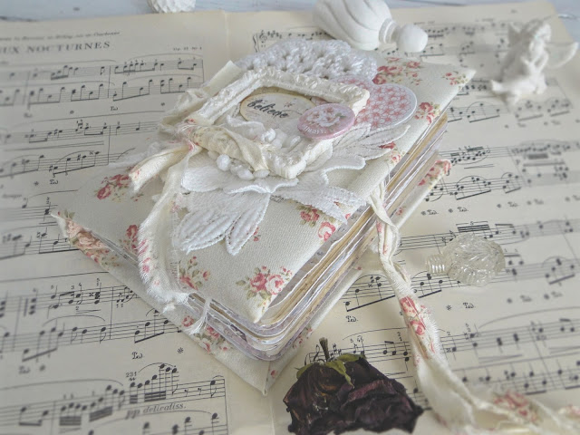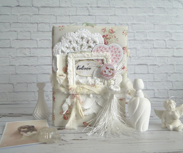 Обложка декорирована бумажными розочками на подложке, полубусинки, лента, вырезки из скрапбумаги, скелетированый листик. Ну и само винтажное сердце с кружевом.
