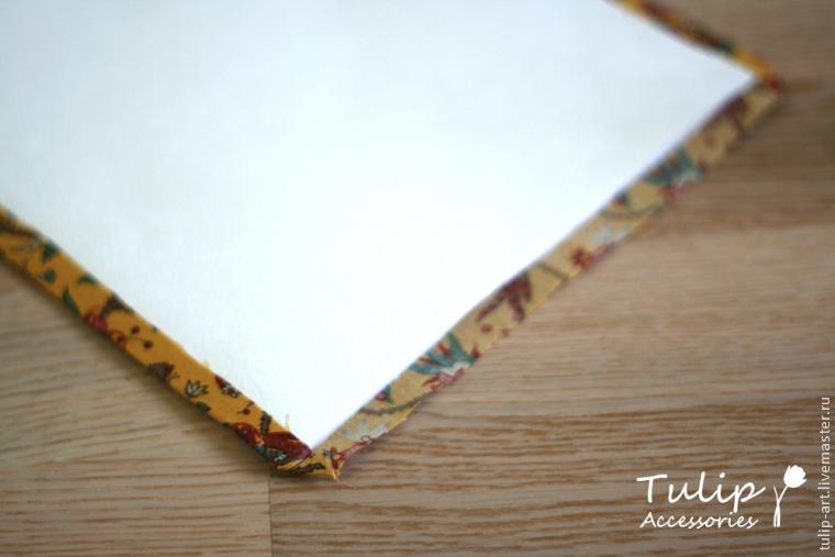 Далее нам нужно обернуть наши заготовки для обложки тканью, проклеивая по краям и аккуратно загибая уголки.