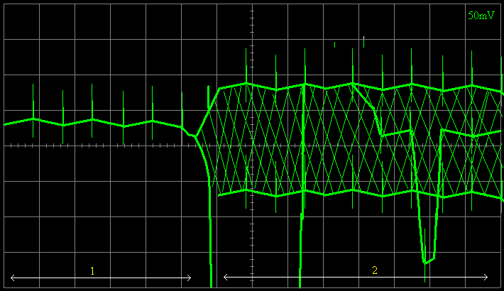 На Рис.2 участок №1 – статическая нагрузка.Участок №2 – HDD в режиме чтение/запись. Характерны провалы напряжения питания +12В. Величина и длительность провала зависит от параметров фильтра блока питания и мощности HDD.Следствие: Из-за нестабильности шины питания +12В жесткий диск начинает хлопать головами по “блинам”. Появляются бэды. Глюки устройств питающихся от шины +12В (ISA карты, COM порты)
