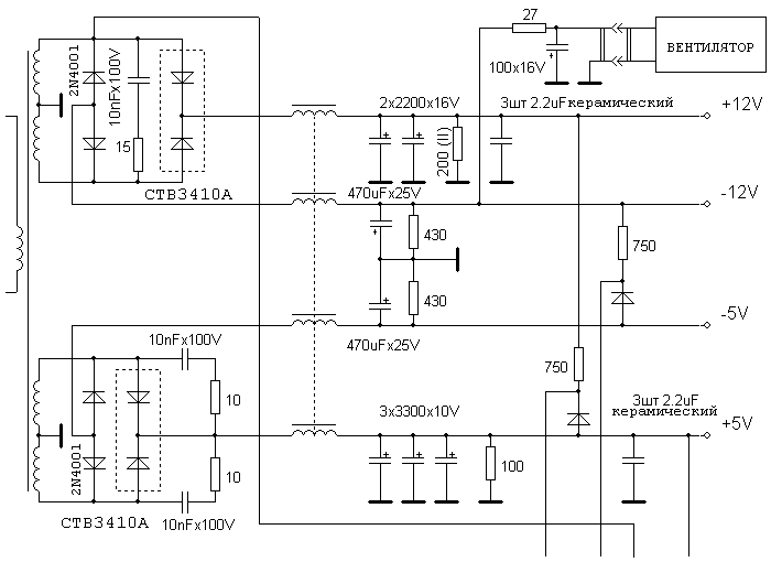 Выпрямитель вторичных напряжений и фильтр, после переделки должны выглядеть следующим образом: