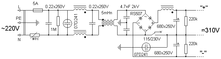 Из всех элементов в схеме фильтра обычного БП присутствует только терморезистор PS405L и предохранитель. (самое необходимое)Иногда ставят симметричный трансформатор (на схеме – 5mH). Само собой — выпрямитель RS205 и высоковольтный фильтр постоянного тока (2 электролита 220х200В)