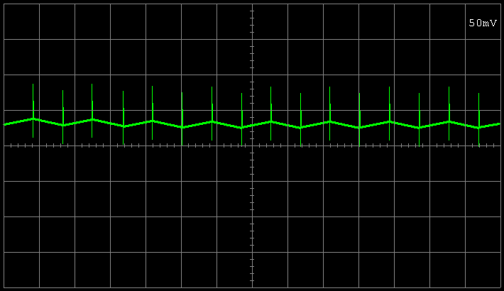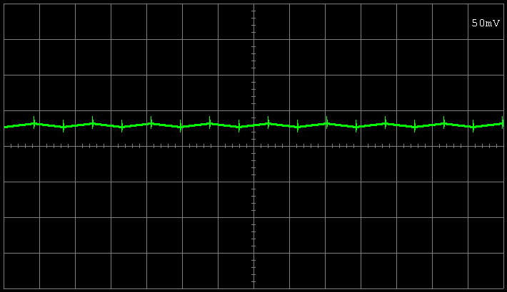 Так выглядит под нагрузкой “поверхность” напряжения брендового блока питания.Присутствуют выбросы напряжения, но они незначительны (много меньше допустимой нормы) и с увеличением нагрузки практически не увеличиваются.Суммарная емкость (мой вариант) электролитических конденсаторов 6800мкФ. Керамических конденсаторов 1.5мкФ. (всё что было под рукой).Для интереса был протестирован блок питания АТХ фирмы PowerMan из корпуса InWin A500 – осциллограмма похожая, но выбросы напряжения отсутствуют.