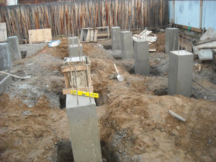 Перед началом создания фундамента происходит выкапывание грунта в местах, где будут установлены столбы. Ширина углубления должна быть больше создаваемого элемента примерно на 10 см со всех сторон. Глубина канав должна рассчитываться на основе данных о весе дома и о глубине промерзания почвы.