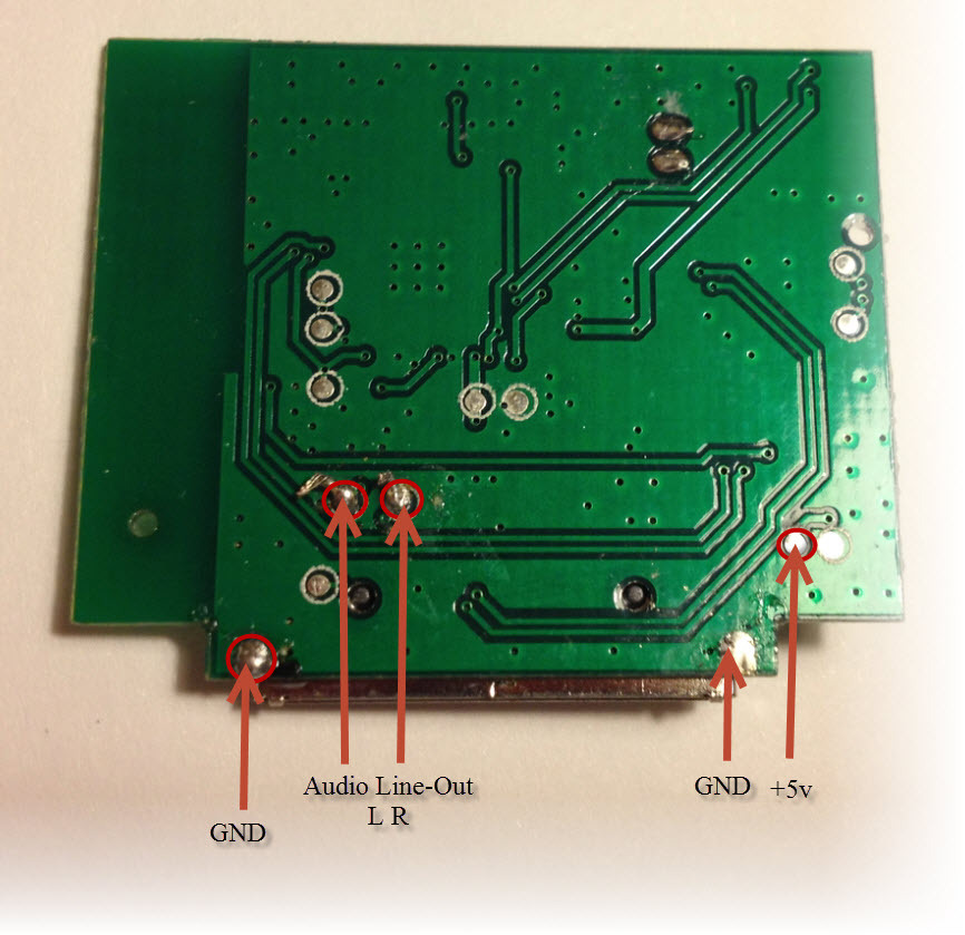 - К трем найденным контактам припаять провода от штекера mini-jack: белый на «L», оранжевый на «R», зеленый на «T». Цвета могут не соответствовать указанным, следует руководствоваться пометками на штекере.