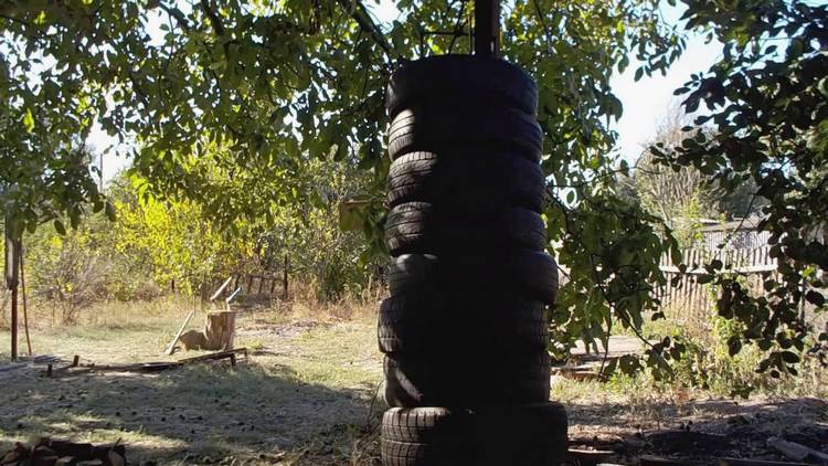 деревянную основу, проверяем, насколько крепко она стоит. - На бревенчатый стержень нанизываем шины. Если общая высота покрышек меньше бревна, нужно их закрепить, чтобы не опускались