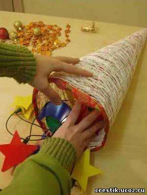 Закреплять декоративные элементы можно нитками, клеем. Можно сделать светящуюся новогоднюю конструкцию. Для этого нужно закрепить на внутренней части конуса гирлянду.