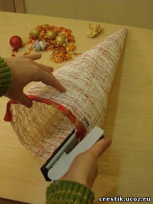 Низ ёлки обрабатываем лентой для подарков. Это можно сделать, пришивая ленту иголкой с ниткой, а можно упростить процедуру и сделать это степлером.