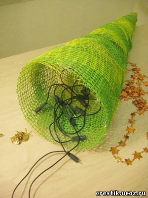 С первого взгляда этот способ кажется менее трудоёмким, чем обматывать конус нитками, но на деле требует большей сноровки и терпения. Сетку стоит нарезать небольшими отрезками, для начала ее можно закрепить на конусе скотчем или булавками.