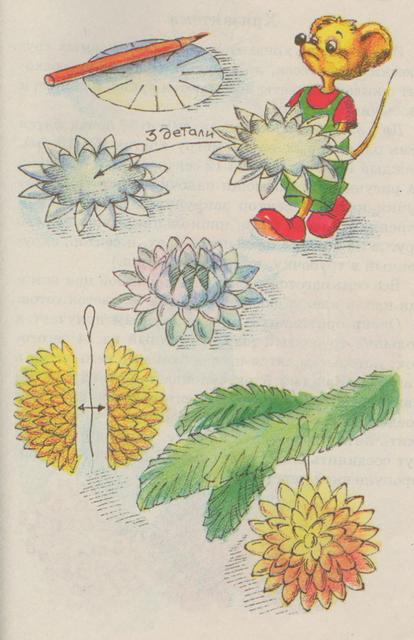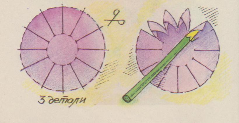 Вырезаем 14 кружков одинакового размера и цвета. Каждый кружочек с помощью циркуля и карандаша разделим на 12 равных частей. Сделаем надрезы по каждой из одиннадцати линий с краю, но не доходя до центра примерно полсантиметра. Получатся 12 секторов. Каждый из них с помощью карандаша свернем кулечком и закрепим клеем. (см. рисунок) То же самое проделаем со всеми четырнадцатью кружками.