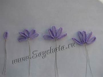 Первым делом гибкую проволоку разрезают на кусочки длиной 20 либо 30 см. На каждую из них нанизывают бисер по 5 или 6 штук. После этого кончики проволоки соединяют, чтобы получился красивый листочек. Далее формируют ветку. На одном уровне друг против друга связывают по 2 лепестка. После чего соединяют их уже по 3 штуки вместе.
