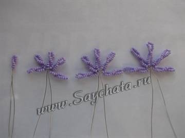 В такой же технике создайте еще 49 веток. Теперь их нужно сгруппировать по пять. Для этого оставляйте свободным конец проволоки, теперь просто скрутите эти части ветвей, чтобы каждая состояла из пяти заготовок.