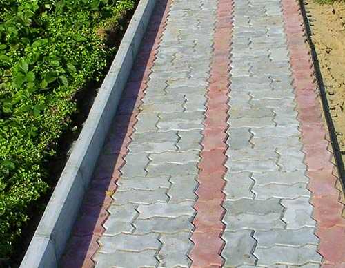 - Садовый или тротуарный бордюр. Имеет меньшие размеры и вес, армирование не выполняется. Используется для оформления садовых дорожек на загородных участках, а также в городских условиях (в парке, по краю тротуара). Не рассчитан на серьезное давление — выдерживает случайный наезд колесом, но при постоянной нагрузке склонен к разрушению. Популярны блоки размером 1000х200х80 и 500х200х70 мм, с соответствующим весом 40 и 20 кг.
