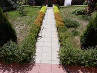 Это самый красивый и самый сложный в исполнении вариант. Для изготовления «живого» бордюра лучше всего использовать такие растения, как горизонтальный кизильник или самшит. Для того чтобы дорожка получилась гармоничной, ширина зеленой ленты не должна превышать 30 см. Устраивается бордюр в этом случае просто путем высадки растений на небольшом расстоянии друг от друга. Подросшие кустики должны впоследствии плотно сомкнуться.