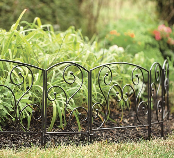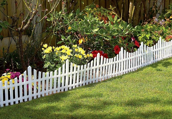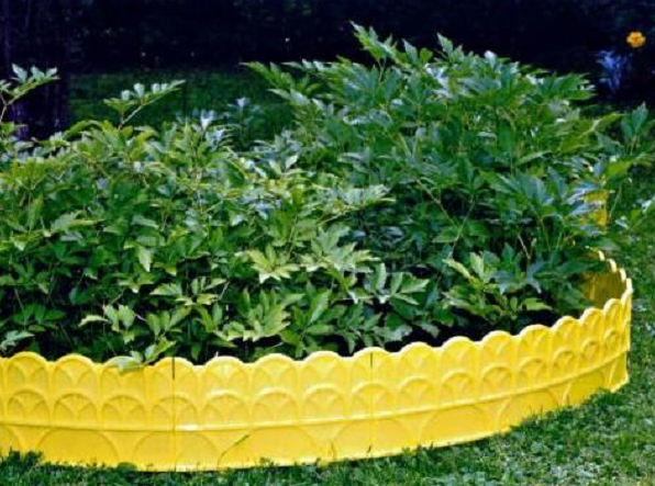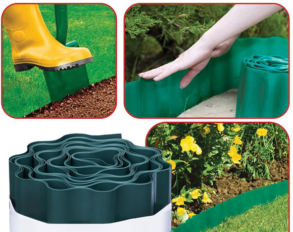 Заготовки из пластика отлично подходят для ограды, они могут быть лентами или фигурные. Полимер устойчив к перепадам температур и осадков. Кому нужен эконом вариант – это лучшее решение, а расцветки есть оранжевые, зеленые или шоколадные цвета. Для них нужна канавка в 2-3 см, в нее вставляют ленту, затем уплотняют.