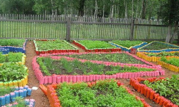 Бутылки из пластика часто используют в дачных ограждениях, но это не прочный материал, а временный. Они подойдут для ограды клумбы на короткий срок. Бутылки обрезают посередине и опускают в грунт, для придания красоты можно сверху покрасить.