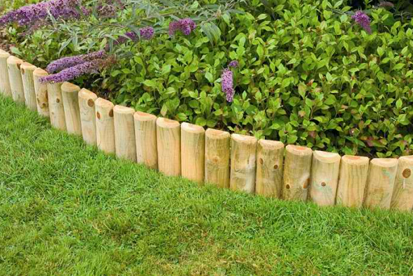 Бордюр из дерева легко соорудить собственными руками, но он может быстро сгнить. Заготовки нужно установить на песок (примерно 5 см толщиной), вбивать в землю удобно киянкой. Ограда может быть плоскими дощечками или круглыми отшлифованными чурбаками.