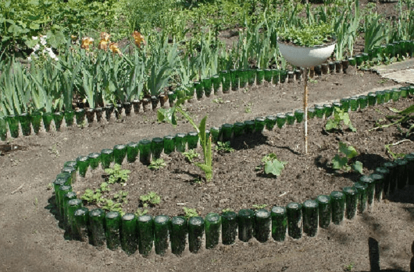 Используя этот бросовый материал, можно устроить бордюр даже для самой длинной дорожки буквально за пару-тройку часов. Конечно, особенно красивым он не будет, но зато и обойдется в копейки. Для того чтобы сделать бордюр, бутылки просто вкапываются в землю горлышком вниз. Разнообразить дизайн ленты можно, используя материал разных цветов. Само горлышко у бутылок перед вкапыванием желательно срезать. Вкапывать их нужно до половины высоты.