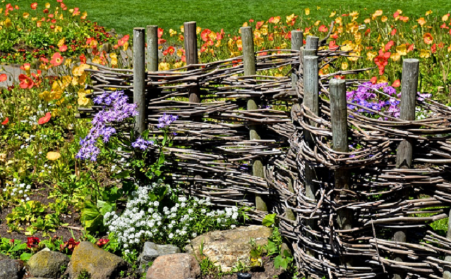 Чурбаки вкапываются вдоль дорожки на расстоянии, равном длине ивовых прутьев. Между ними втыкаются палочки. Далее заплетают Их предварительно лучше вымочить, тогда работать будет удобнее. Для плетения прутья используют по нескольку штук (по 2-3). Каждый пучок проводят за первой палочкой, затем перед второй и т. д. Скреплять прутья между собой можно тонкой проволокой. После того как будет готова первая секция, приступают к плетению второй.