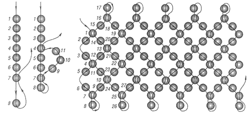 нить НАД и обратно ПОД правым концом, опять через бусину, далее НАД