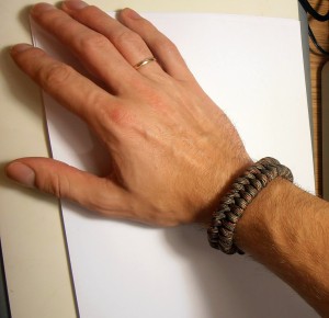 Для начала берётся шнур из паракорда (в статье 5 метров) и складывается пополам, согнутый конец шнура обматывается плотной нитью на кончике, чтобы изгиб держался плотно. Измеряем длину браслета: прикладываем зафиксированный конец к изгибу кисти своей руки и обхватываем вокруг кисти. Полученную длину фиксируем пальцами. Делаем ещё два загиба троса с двух сторон и подтягиваем к фиксированному изгибу. Должно получиться четыре параллельных ряда шнура. Теперь слева направо делаем петлю левым крайним шнуром и одеваем на правый крайний. Вытаскиваем конец правого крайнего шнура наружу. Делаем фиксирующую петельку.