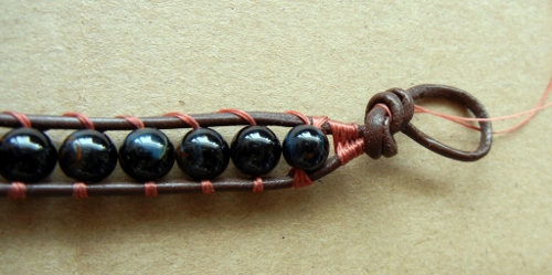 Кладем на ровную поверхность кожаные шнуры параллельно друг другу на расстоянии 1 см. Кожаную нить вдеваем в иголку, фиксируем на шнуре и начинаем обшивать шнуры, а между шнурами вставляйте бирюзу.