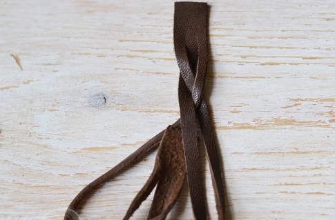 Отрезаем два куска цветного тонкого шнурка. Их длина должна быть больше, чем кожаной заготовки, так как мы будем формировать петлю для пуговицы именно из шнурка.