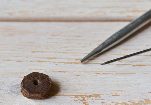 Когда стопка из кусочков кожи склеена, обрезать края по кругу, для более аккуратного вида можно обработать край шкуркой. В середине сделать отверстие при помощи шила (можно его предварительно раскалить).