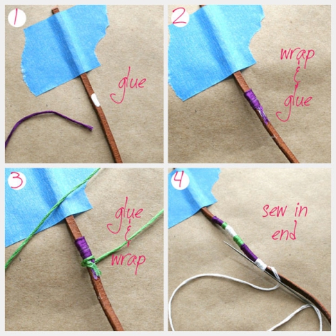 - Закрепите шнур скотчем. На расстоянии, примерно равном 5 сантиметрам, капните клей и прикрепите первый цвет мулине. Начинайте туго обматывать нитку вокруг шнура, пока не дойдете до нужного вам расстояния. Снова поставьте каплю клея и закрепите эту нить.