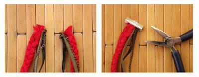 Возьмите нить трех цветов, полоску кожу, несколько цепей, заглушку с застежкой, ножницы и клей.