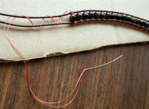 - На одну из нитей начните нанизывать своими руками бусины, закрепляя их с обеих сторон узелками. Проделайте то же самое со всеми остальными нитями.