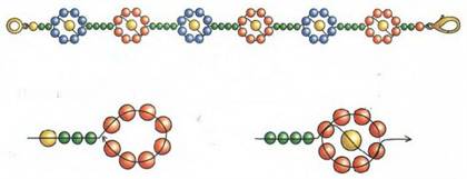 Потом набираем еще две бусины и вводим их в сторону второго звена и верхнюю часть прошлого узора. Иглу выводим через бок и верх полученного креста. Потом закрепляем застежку. Готово!