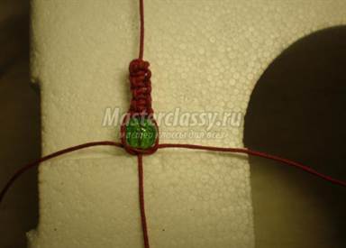 В месте, где должна быть бусина придвиньте первую бусину близко к сплетенным плоским узлам. Рабочие нити разместите по обе стороны бусины и завяжите плоский узел уже за бусинкой.