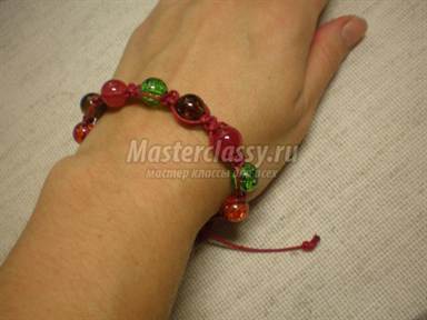 Проделав всё это, приступай к завершению плетения. Бусину на центральной нити укрепи узлом, то же самое сделай и с самой первой бусиной. Обязательно следи за количеством узлов во время изготовления браслета, их должно быть ровно 5!