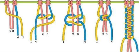 Выполняем плоские узлы. Ниже приведена схема плетения плоских узлов. На рисунке все нити помечены разными цветами.
