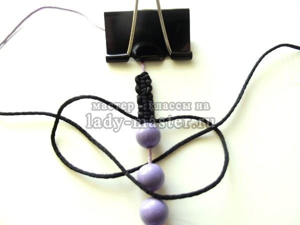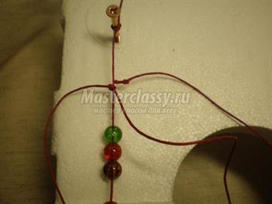 Сразу учитывайте, чтобы нить проходила в отверстие бусины. Эффектно смотрится, когда для центральной нити берут двойной шнур (два шнура).