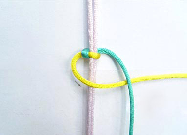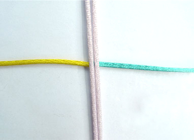 Прежде чем приступать непосредственно к созданию браслета, необходимо освоить технику плетения квадратных узлов. Для этого нам понадобятся три шнура разных цветов, к примеру, белый, желтый и голубой. Центральный шнур (в данном случае белый) должен быть длиной около 50 см, оставшиеся два – по 70 см. Шнуры необходимо закрепить и в процессе плетения следить за тем, чтобы белый всегда оставался в центре и был хорошо натянут.