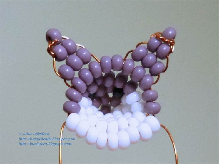 Для начала отрезаем кусок проволоки, в данном случае 1,5 м. Это будет наша голова и туловище. Плетем несколько рядов, пока не образуется достаточный «нос». Берем пару кусков проволоки по 20 см и продеваем через бусины, чтобы получились ушки, смотрите фото ниже.