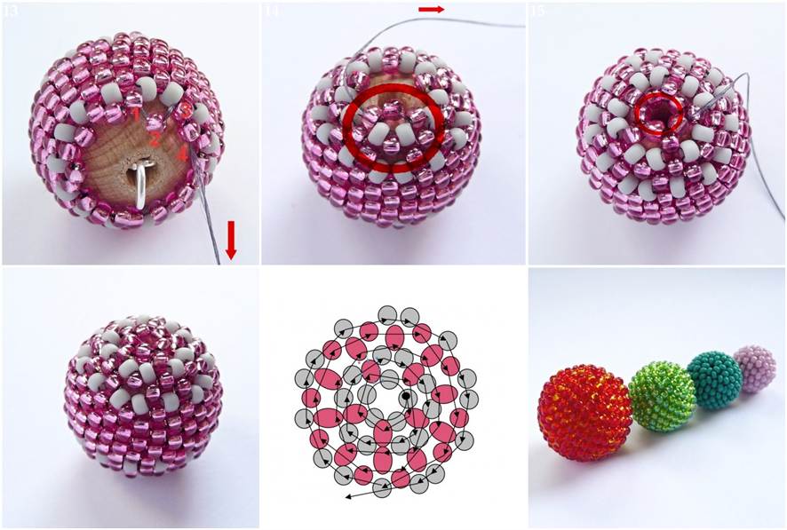 Шары из бисера делаются также несколькими способами. Первый — это оплетение деревянной бусины мозаичным методом, который предполагает использование более дорогого бисера.