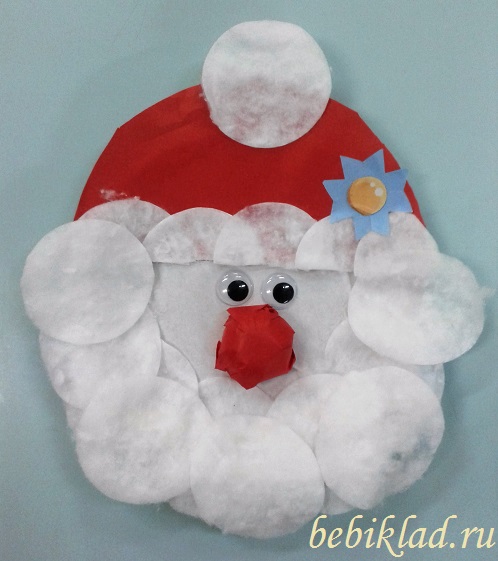 Из ваты сделайте опушку на шубе и шапке. нарисуйте глаза, нос и рот деда мороза из ваты своими руками.
