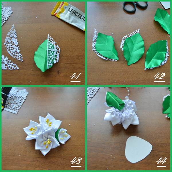 Основа из белой ленты присоединяется к полученному цветку с изнаночной стороны наподобие листиков.