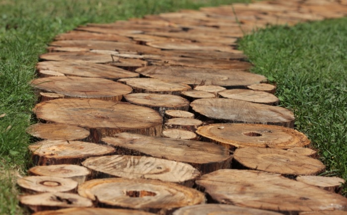 Поделки из пеньков можно использовать и для украшения вашего участка, например, сделав из них такую привлекательную дорожку из спилов дерева, которой можно дополнить вашу дачную тропинку. Обязательно убедитесь, что деревянные компоненты плотно прилегают к земле, чтобы избежать неприятностей, а затем оформите их камушками и мхом, чтобы придать новый облик вашей дорожке из гравия.