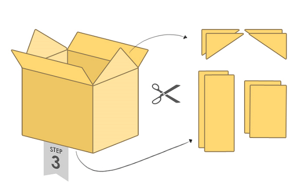 Этот вариант потребует от вас чуть больше внимательности и аккуратности. Мы будем не просто соединять между собой картонные клапаны коробки, а формировать и буквально выкраивать двускатную крышу для будки. Подготовьте вместительную картонную коробку. С помощью канцелярского ножа отрежьте клапаны коробки с одной стороны, а с другой их нужно обрезать как на картинке: