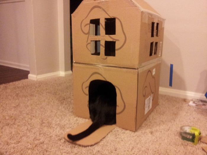 Из картона можно создать целый город для кошки, да и собаке в таком большом доме найдется место, если, конечно, у вас не лабрадор или доберман, тогда придется запастись большим количеством материала.
