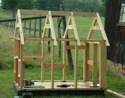 В данном случае видоизменяется каркас в соответствии с уклоном крыши. То есть, передние стойки выше задних, а промежуточные получаются средней величины, но их устанавливают только после крепления верхней обвязки. Всё остальное ничем не отличается от сооружения с – та же потребность в утеплении и гидроизоляции, а также в обработке древесины антисептиком.