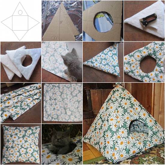 Для начала из картона нужно вырезать 4 четырехугольника и один квадрат. Размеры выбирайте в зависимости от того, какого размера вы хотите получить вигвам. В одном из треугольников нужно вырезать круг — это будет вход для вашего питомца. Из синтепона также нужно вырезать 4 треугольника и квадрат — это будет ваш утеплитель. Теперь осталось прикрепить синтепон к картонным деталям, обшить их тканью и соединить вместе все части будки.
