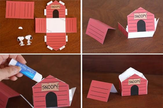 Для начала нужно распечатать и вырезать выкройку будущей собачьей будки. Теперь возьмите стержень ручки и проведите по линии сгибов, чтобы конструкцию можно было аккуратно согнуть. Далее в местах склеивания проведите канцелярским клеем и хорошо сожмите. Ваша небольшая поделка готова.