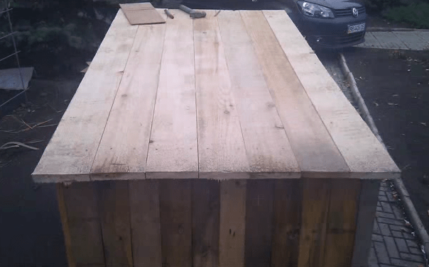 - Боковые стенки обшить досками. Верх закрыть длинными досками поверх фанеры.