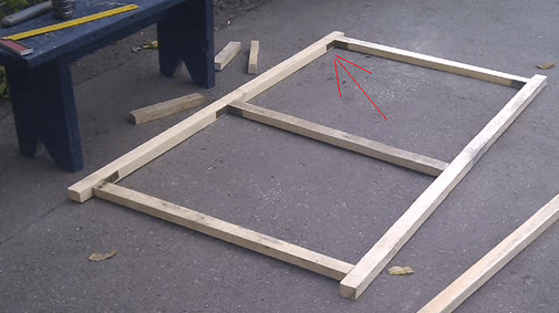 Ну что, приступаем к строительству конуры! Первым делом готовим раму днища. Для этого брус 40х40 обрезаем по размеру, рассчитанному в чертеже, Соединяем части бруса, используя металлические уголки. Смотрите, как это выглядит на фото.